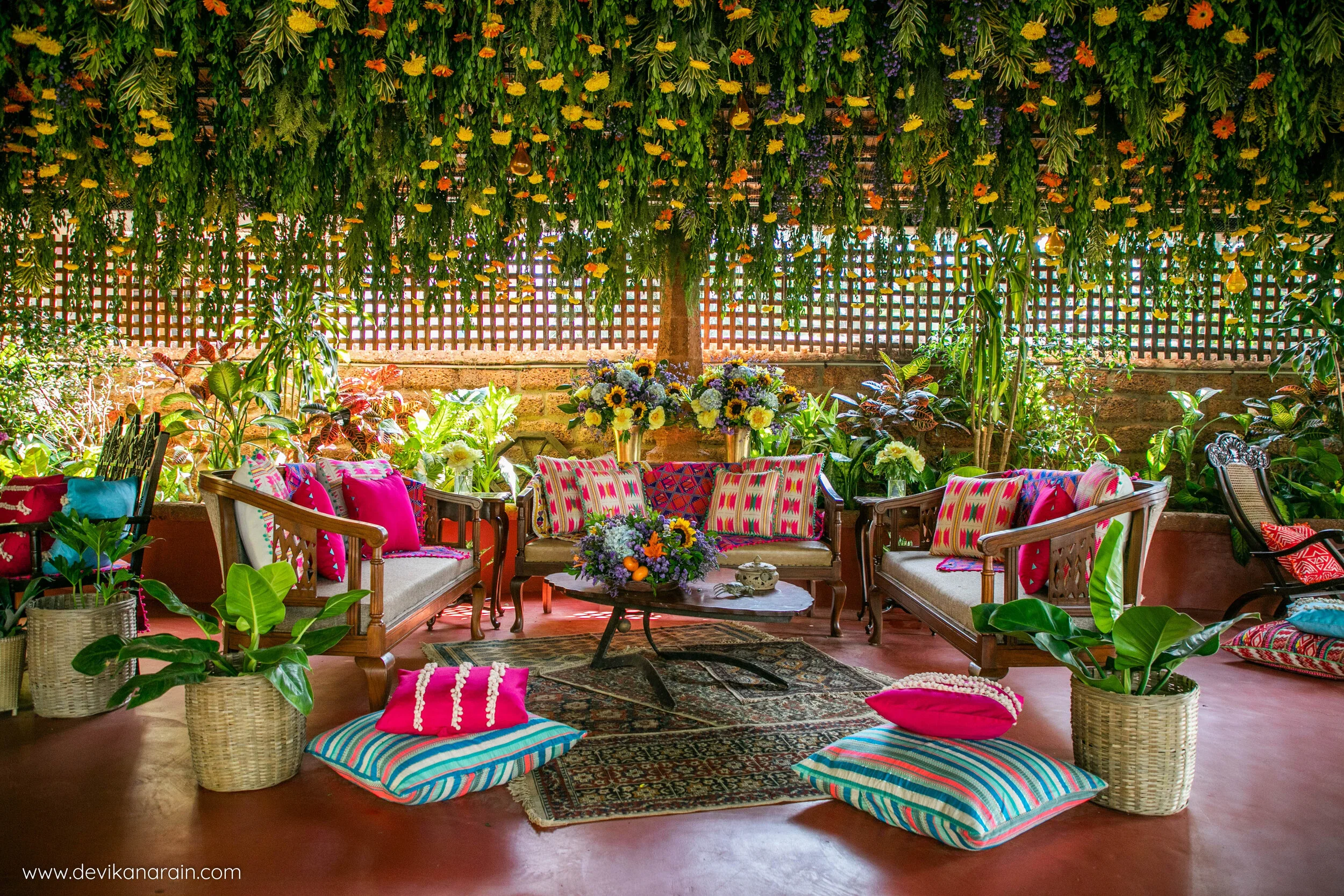 The mehendi at their home in Goa, was a maximal feat. We used things the family had collected from their holidays and added antique furniture, cane lamps and lots of curious boho details to transform the garden into an extension of their home.