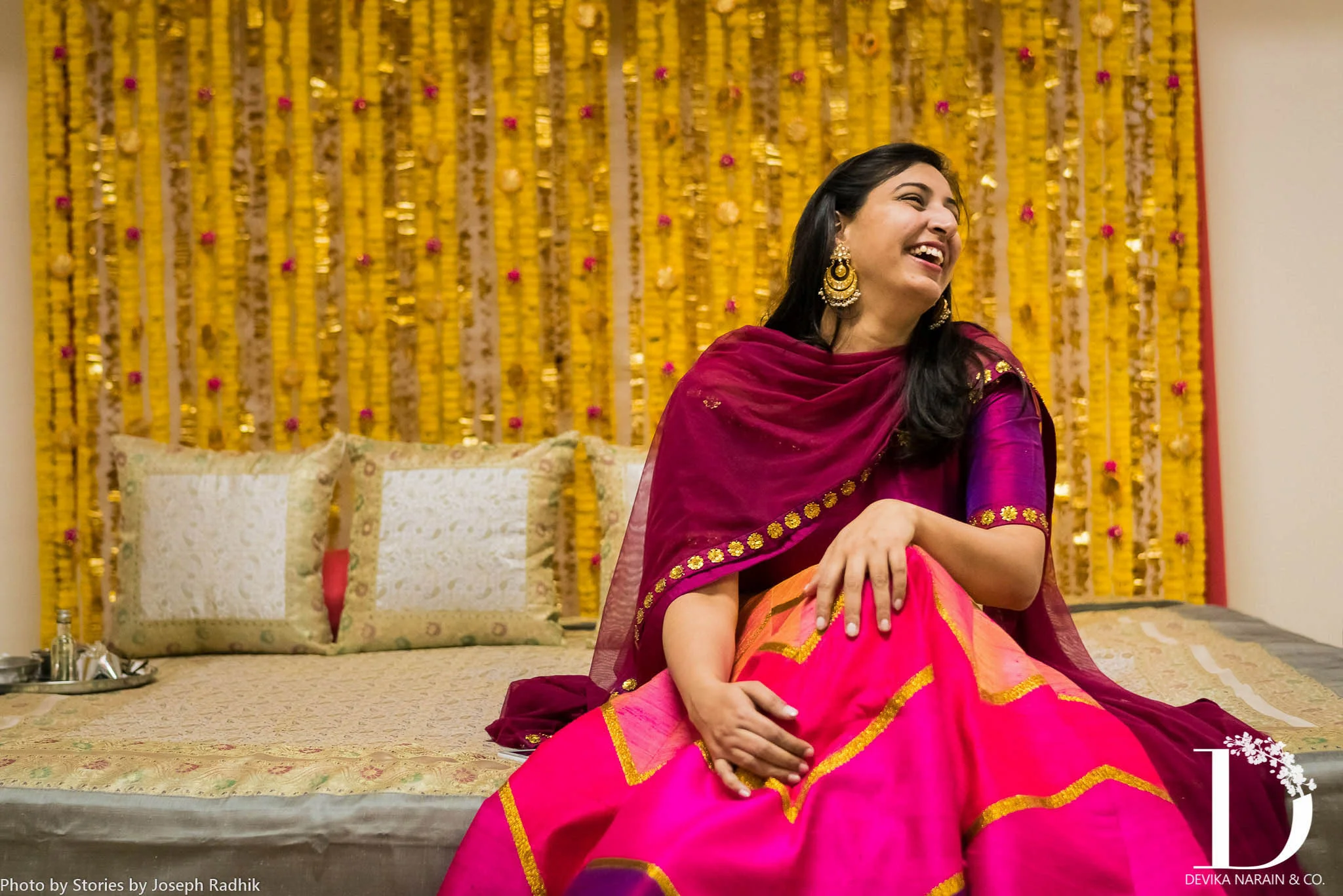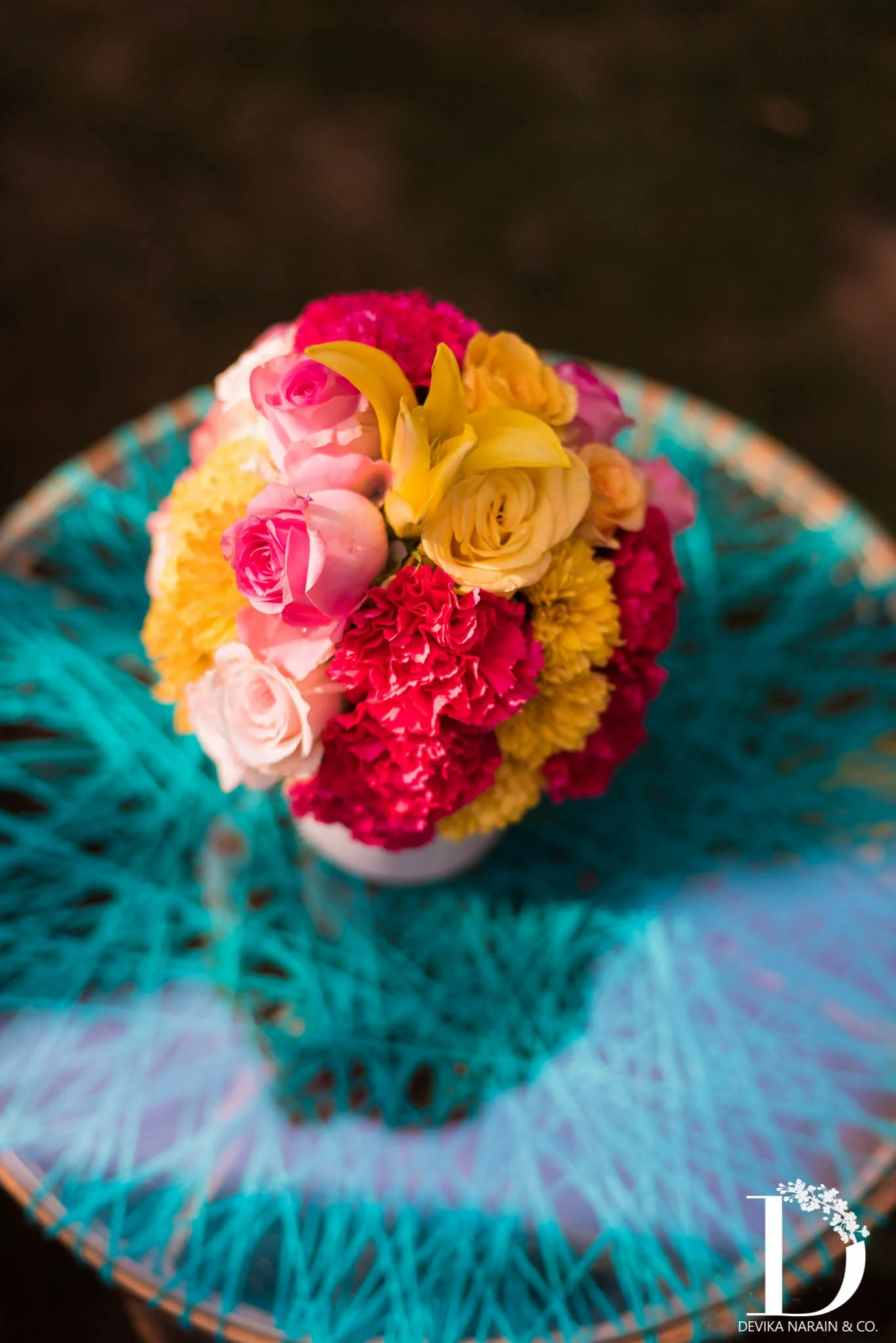 Kanika and her family wanted to retain the spirit of their family home and add colourful Punjabi details to it. A small colourful tent, bright details in the form of gota and pompoms and colourful cushions formed the background to the Mehendi and Haldi held at home.