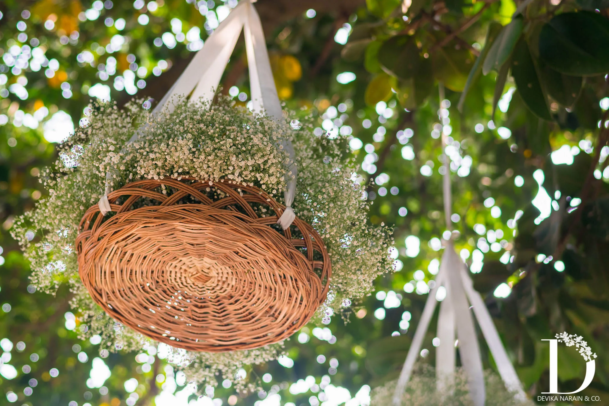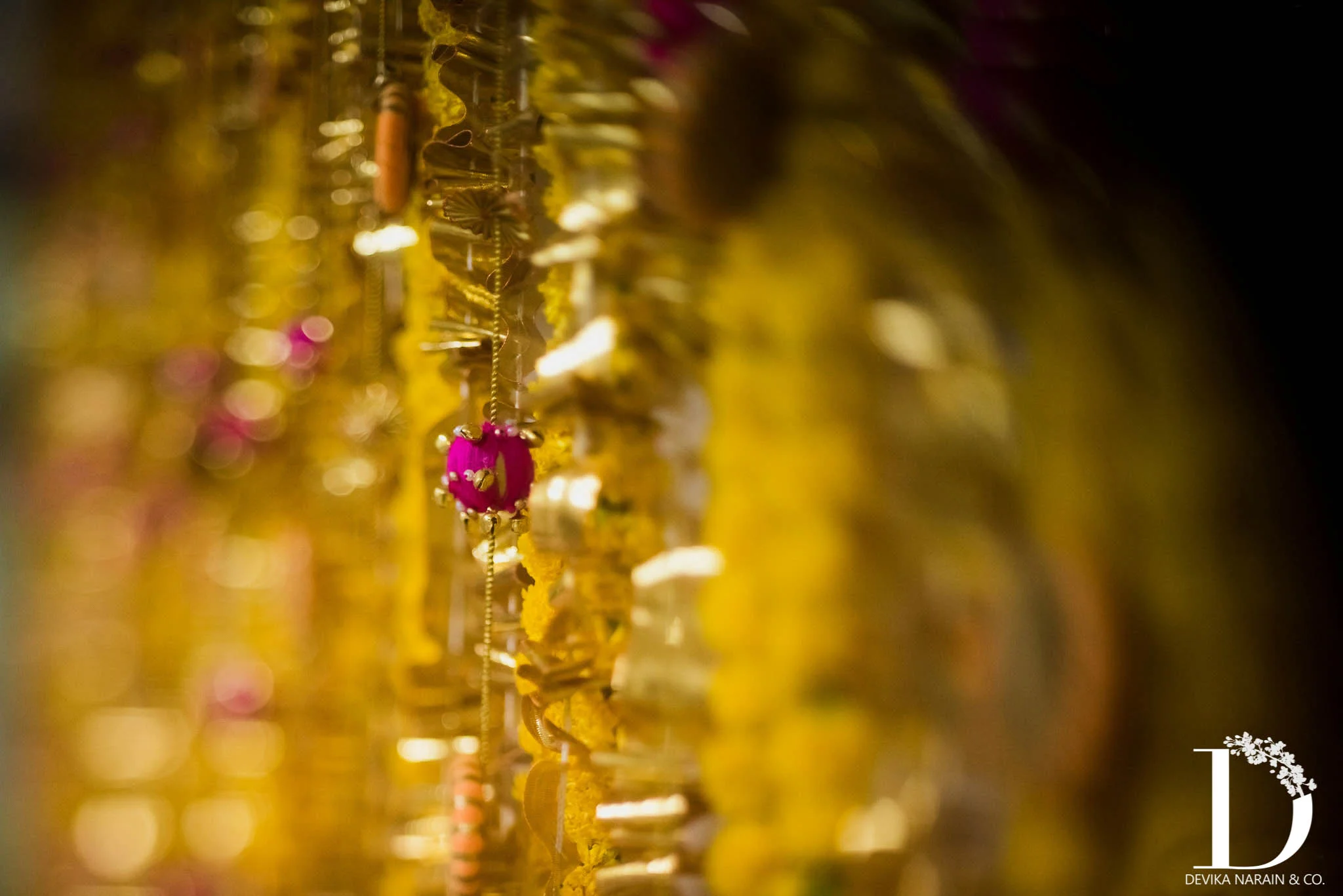 Kanika and Rakshit’s wedding was inspired by Indian Botanical prints. In love with the marigold,the entire setting was created around it. Indian details like mauli, kaliras and ghungrus were mixed with lots of candles and diyas. The reception dinner was set under a canopy of chandeliers with tall candleabras and intimate details like customised thank you notes.