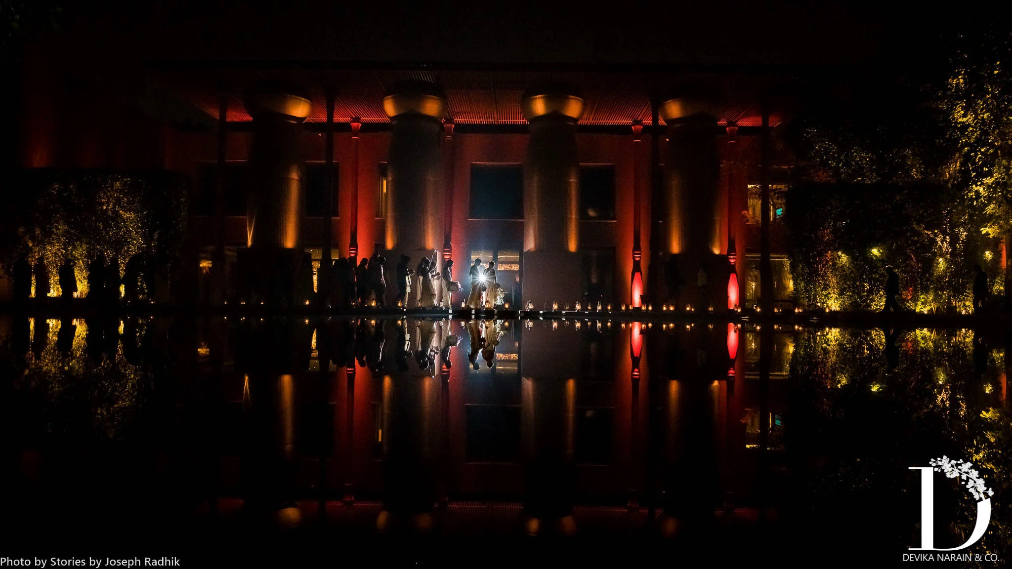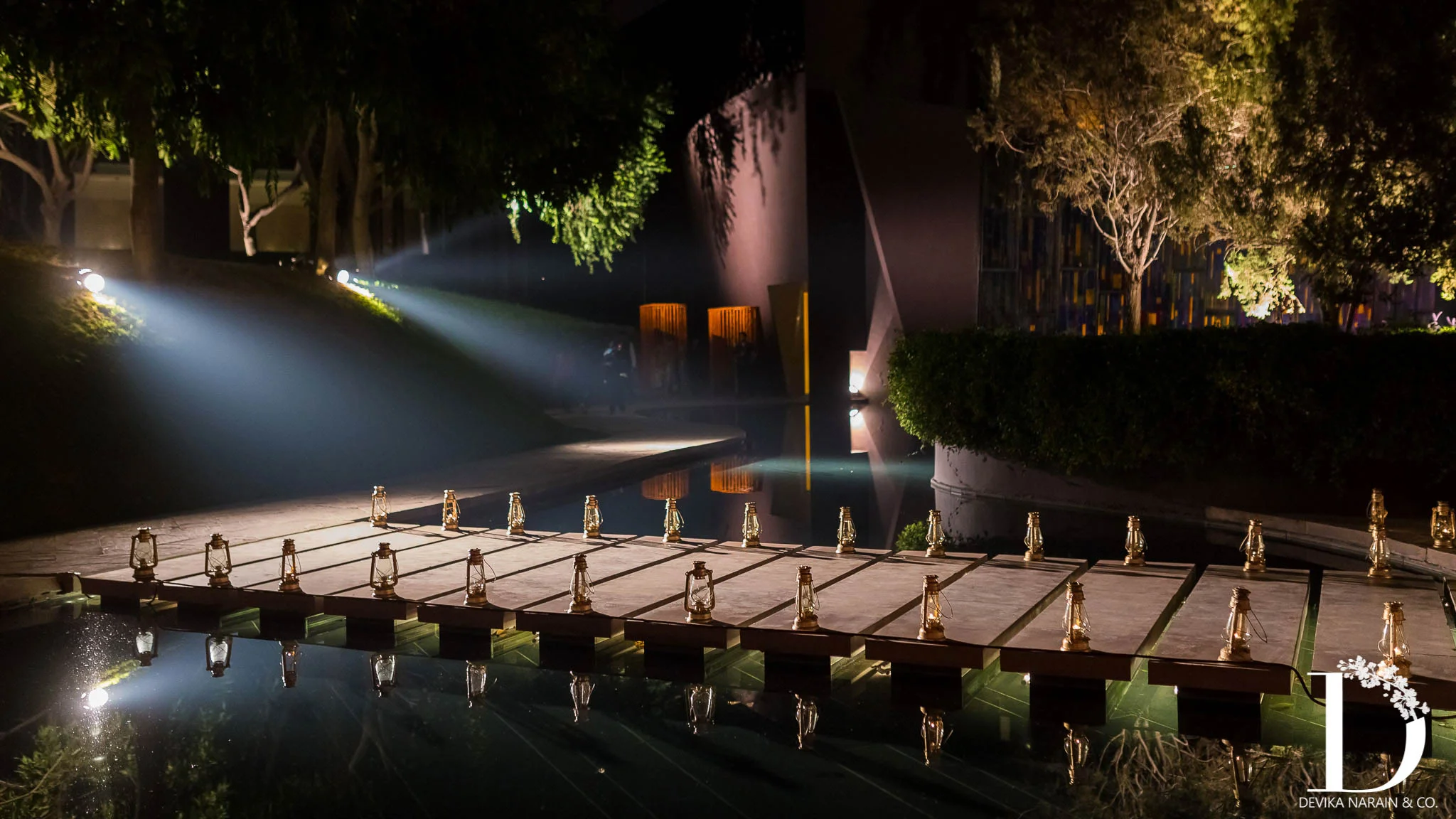 The Dusit is one of the most stunning properties in Delhi! I have always been impressed by the large waterbodies that form the centre of the hotel and wanted to create a design that incorporated them in it. Playing with light and the beautiful reflections of the structures that were cast in the still waters, we curated a design experience that was filled with drama. Floating platforms were created in the water with ceiling made of hexagonal lanterns and greens. The ballroom was transformed into a chic space matching the aesthetic of the restaurant for the sangeet and dinner.