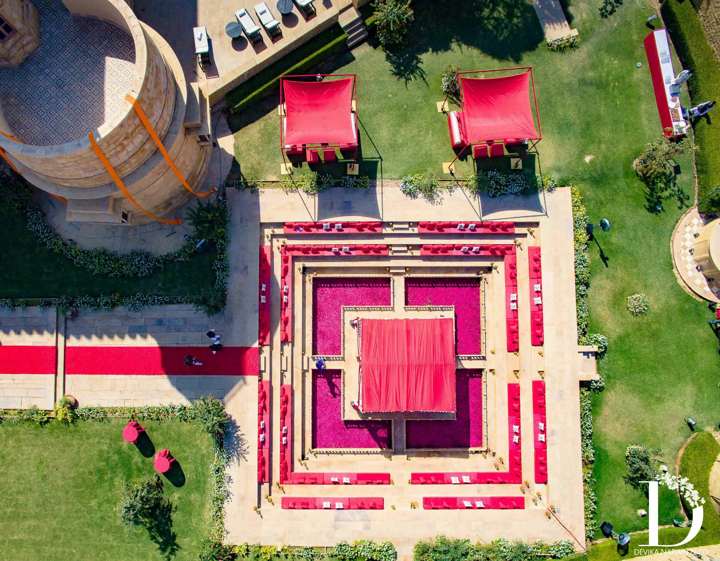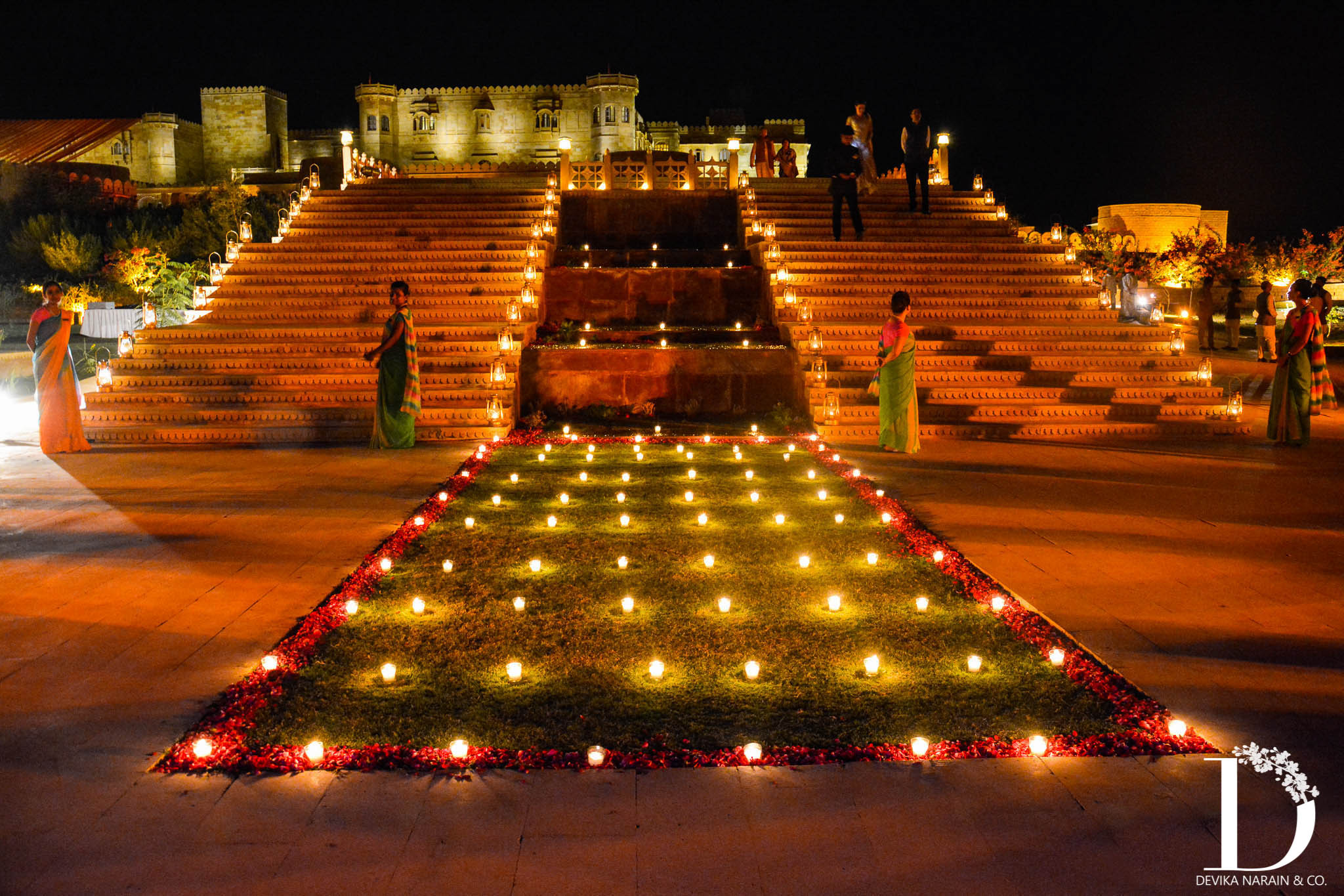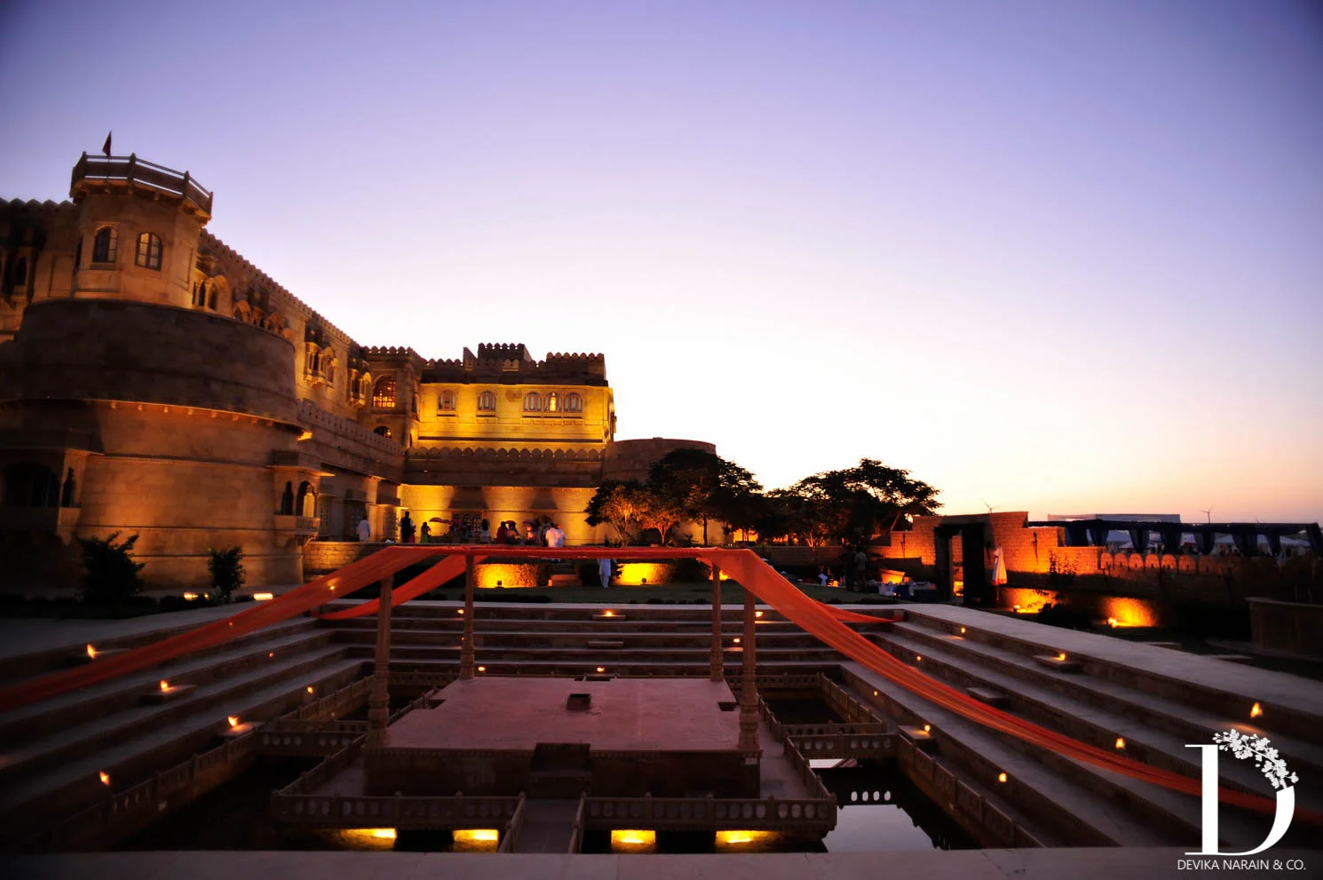 For a hotel with 77 rooms and multiple havelis, Suryagarh has event spaces that can accommodate much more, making it an ideal place for tasteful weddings. The lawns come with a waterbody to lounge around. With the hotel façade in the backdrop, this waterbody, makes for a stunning sight especially at night. It’s perfect for a Sangeet or a welcome dinner - a laidback evening. What defines it from the other venues is the fact that you can actually see barren land on one side and the entire hotel’s façade on the other. Quite a picture!